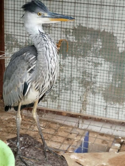 經(jīng)有經(jīng)驗(yàn)的民警辨認(rèn),這是一只蒼鷺幼鳥。這只鳥身高約70公分,長長的尖嘴,身著灰色體羽,頭戴深灰色羽冠,兩條大長腿格外顯眼,白色的前頸縱向排列著黑灰色條紋。民警聯(lián)系獸醫(yī)為其做了體檢,經(jīng)檢查,這只鳥并無傷病,可能是由于剛出窩飛行能力不強(qiáng)、捕食能力不足,造成體力虛弱。民警買來小魚,只見這只鳥狼吞虎咽享用起來,不久便精神十足,開始啄民警??吹剿w力開始恢復(fù),民警懸著的心也就放下了。民警計(jì)劃選擇合適時(shí)間和地方將其放飛。