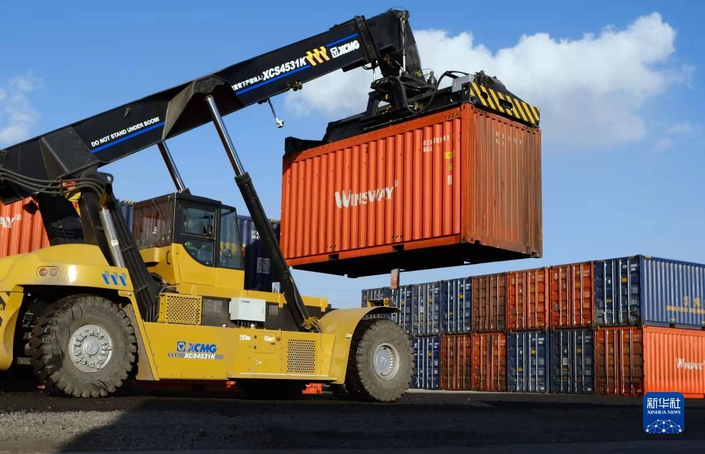包頭市九原區(qū)“數(shù)字陸港”內,吊車從卡車上卸“甩箱”。新華社記者賈立君 攝