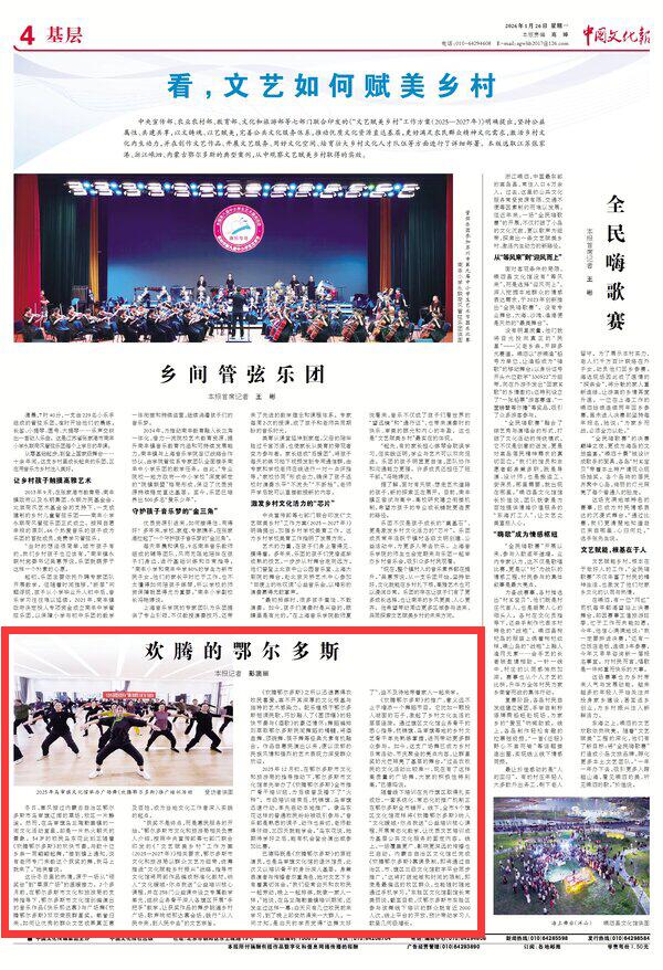 2026年1月26日《中國文化報》第4版刊發(fā)了《歡騰的鄂爾多斯》的文章,報道了廣場舞《歡騰鄂爾多斯》已成為鄉(xiāng)村日?;顒?、節(jié)慶聚會的亮點(diǎn)內(nèi)容,讓群星獎的光芒照亮了基層的舞臺。作品自惠民演出以來,便以濃郁的民族風(fēng)情和強(qiáng)烈的藝術(shù)表現(xiàn)力深受群眾歡迎。