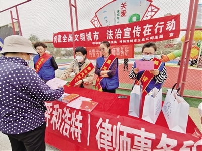 近日,玉泉區(qū)司法局西菜園司法所聯(lián)合正信公證處、祺翰律師事務(wù)所、鵬旭律師事務(wù)所、盛恒律師事務(wù)所在西苑家園小區(qū)廣場(chǎng)開(kāi)展了創(chuàng)城法治宣傳活動(dòng)。(記者 其布日哈斯 攝)