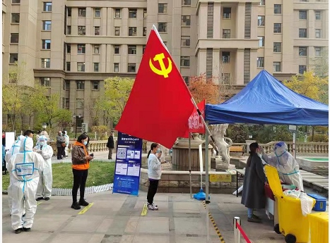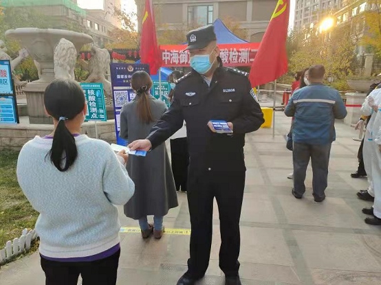 按照樓號的不同,中海物業(yè)的工作人員將居民分成了三隊,分別在西門設(shè)置了三個檢測站。巧報派出所民警岳軍就站在三個檢測站中間的空地上,手里拿著一沓防電信詐騙宣傳材料,默默地注視著排隊的人群。