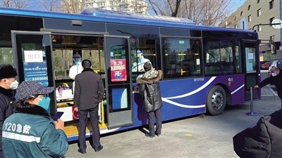 2月28日上午,在呼和浩特市新華大街附近,一輛敞開(kāi)了玻璃窗的公交車(chē)??吭诘缆放?,居民們按照規(guī)定間隔排隊(duì),依次來(lái)到公交車(chē)前進(jìn)行核酸采樣,醫(yī)務(wù)人員坐在車(chē)廂座椅有序地為市民進(jìn)行核酸采樣,受檢人員不用上車(chē),站在窗外,采完即走。