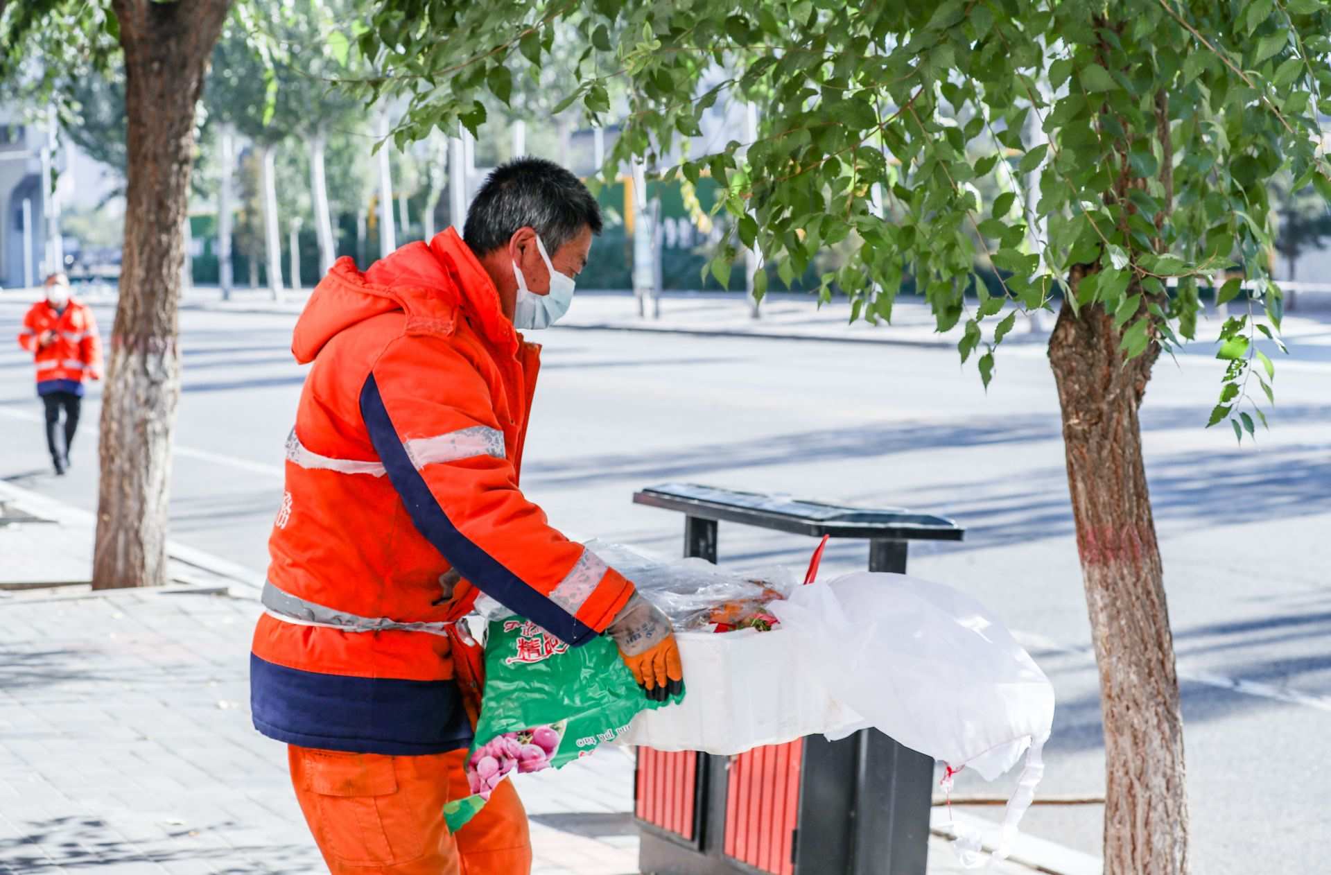 10月18日,呼和浩特市賽罕區(qū)環(huán)衛(wèi)工作人員正在進(jìn)行清掃清理工作。為切實(shí)做好疫情防控期間呼和浩特市生活垃圾清運(yùn)工作,讓城市清潔無死角,環(huán)衛(wèi)部門工作人員堅(jiān)守在城市街頭、社區(qū)等工作崗位,在做好自身防護(hù)的同時(shí),維護(hù)著城市的清潔環(huán)境。攝影/草原全媒·正北方網(wǎng)首席記者 牛天甲