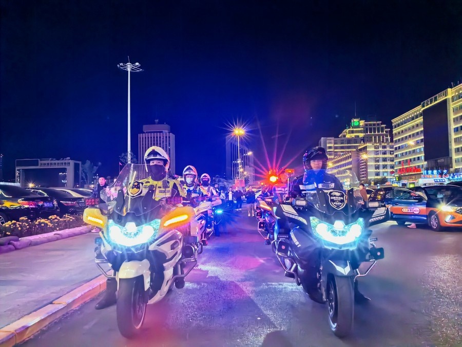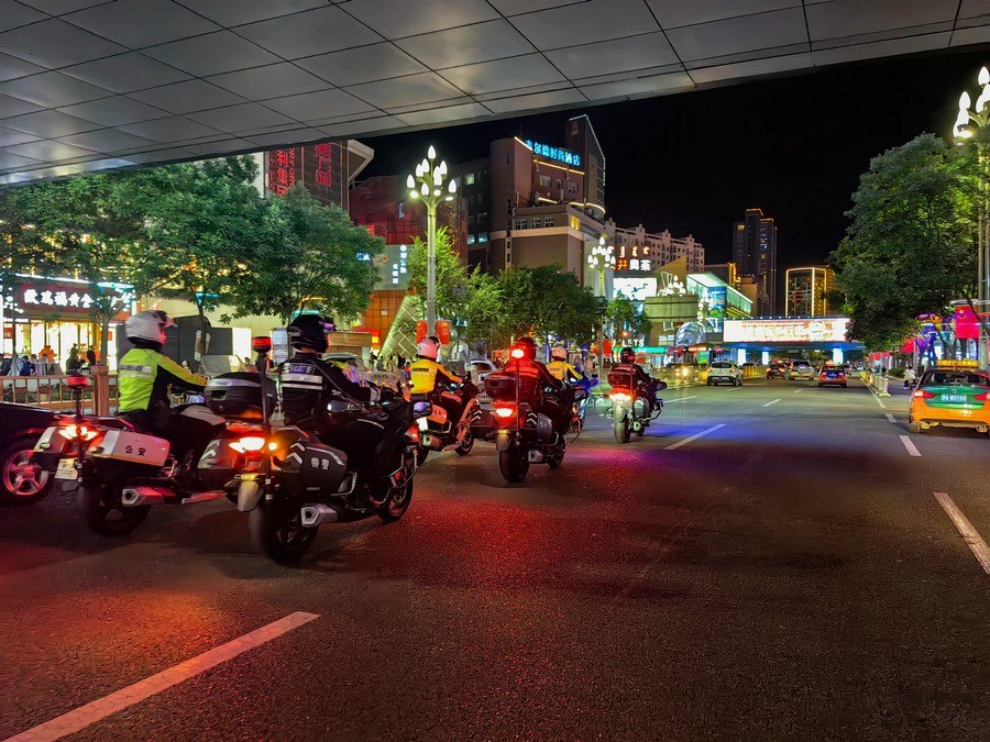 中秋、國(guó)慶兩節(jié)期間,呼和浩特市公安局反恐怖和特巡警支隊(duì)?wèi)?zhàn)鷹突擊隊(duì)與交警支隊(duì)停放管理大隊(duì)鐵騎中隊(duì),聯(lián)合開展巡邏防控工作,并組成了一支騎警處突機(jī)動(dòng)隊(duì),成了呼和浩特大街小巷一道亮麗的風(fēng)景線。圖為中秋節(jié)之夜,這支機(jī)動(dòng)隊(duì)開展聯(lián)合巡邏,守護(hù)青城百姓平安過節(jié)。 王鑫 攝影報(bào)道
