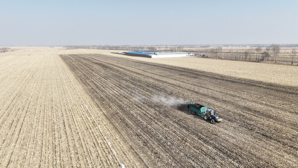 3月8日,農(nóng)民駕駛農(nóng)機(jī)在內(nèi)蒙古興安盟扎賚特旗音德爾鎮(zhèn)巨寶村一處農(nóng)田中拋撒有機(jī)肥(無人機(jī)照片)。驚蟄節(jié)氣后,內(nèi)蒙古興安盟扎賚特旗各項(xiàng)備耕工作有序推進(jìn)。扎賚特旗是我國重要的產(chǎn)糧大縣,2024年糧食總產(chǎn)量達(dá)49.5億斤。(新華社記者 貝赫)
