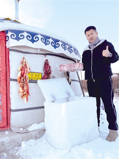 12月8日,記者幾經(jīng)周折與視頻中的小伙張智磊取得了聯(lián)系。張智磊今年36歲,從小在錫林郭勒大草原長大,在當(dāng)?shù)刂饕雠Q蛉馍?。對于意外走紅,張智磊直言自己也沒有想到?!耙曨l是在錫林浩特市南郊向陽村叔叔家院子里的蒙古包拍攝的。記得小時候,每到冬天,周邊牧民都是把食物埋在雪地里儲存。我前幾天也拍了一個從雪地里找羊腿的視頻,有粉絲留言‘放在雪地里會不會忘記位置容易丟了’,然后我就突發(fā)奇想,干脆做個‘冰箱’把年貨放進去?!睆堉抢诟嬖V記者,他從12月3日開始凍冰塊,12月4日把凍結(jié)實的冰塊拿出來用冷水黏合,因為冰塊低于0攝氏度,遇水就會瞬間黏在一起,然后開始著手打磨,棱棱角角都用電熨斗熨平整,再加上蓋,一個“冰箱”就完成了。