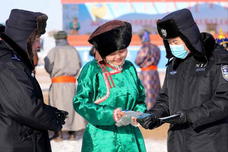 錫林郭勒邊境管理支隊達來、洪格爾、巴音都蘭等3 個邊境派出所共派出20多名警力,對于前來參加那達慕的人們進行嚴格檢查,并向牧民群眾講解當前面臨的新冠肺炎疫情防控形勢,發(fā)放宣傳冊。(內(nèi)蒙古日報記者 巴依斯古楞 攝影報道)