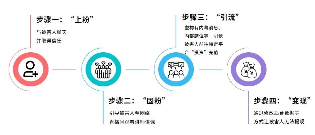 接下來(lái),講師會(huì)通過虛構(gòu)有內(nèi)幕消息、內(nèi)部席位等情節(jié),將被害人“引流”至團(tuán)伙自制的“長(zhǎng)盛資本”“瑞達(dá)資產(chǎn)”“匯利資產(chǎn)”等平臺(tái)“投資”充值,后把握時(shí)機(jī),通過修改后臺(tái)數(shù)據(jù)等方式讓被害人無(wú)法提現(xiàn),卻成為他們的“變現(xiàn)”時(shí)刻。至案發(fā)時(shí),該團(tuán)伙已詐騙多名被害人,犯罪金額共計(jì)人民幣500余萬(wàn)元。