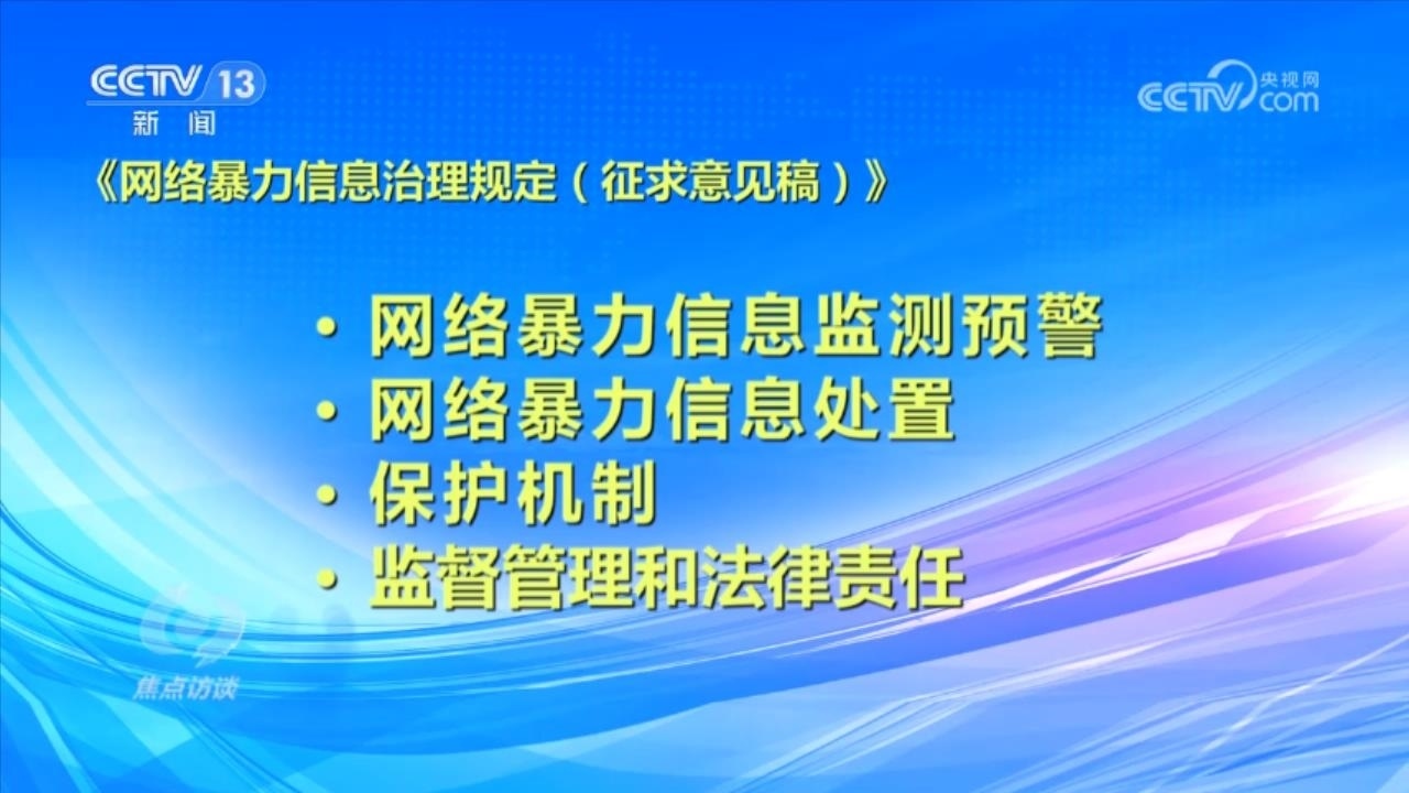 央視網(wǎng)消息(焦點訪談):俗話說“舌上有龍泉,殺人不見血”。網(wǎng)絡暴力不同于現(xiàn)實中的拳腳相加,但是這些在網(wǎng)絡空間中用文字、圖片等方式進行的傷害和侮辱,一樣可以對當事人的現(xiàn)實生活產(chǎn)生惡劣的影響,讓當事人的心靈“流血”。在傷害當事人的同時,網(wǎng)絡暴力行為也嚴重污染了互聯(lián)網(wǎng)環(huán)境,影響社會和諧穩(wěn)定。近日,國家互聯(lián)網(wǎng)信息辦公室起草了《網(wǎng)絡暴力信息治理規(guī)定(征求意見稿)》,向社會公開征求意見;同樣是針對網(wǎng)絡暴力,在6月,最高人民法院、最高人民檢察院、公安部起草了《關于依法懲治網(wǎng)絡暴力違法犯罪的指導意見(征求意見稿)》,面向社會公開征求意見。治理網(wǎng)絡暴力這顆“毒瘤”,營造良好生態(tài)勢在必行。