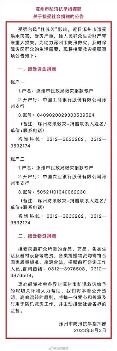·河北涿州接受社會(huì)捐贈(zèng),救災(zāi)捐款專戶公開。