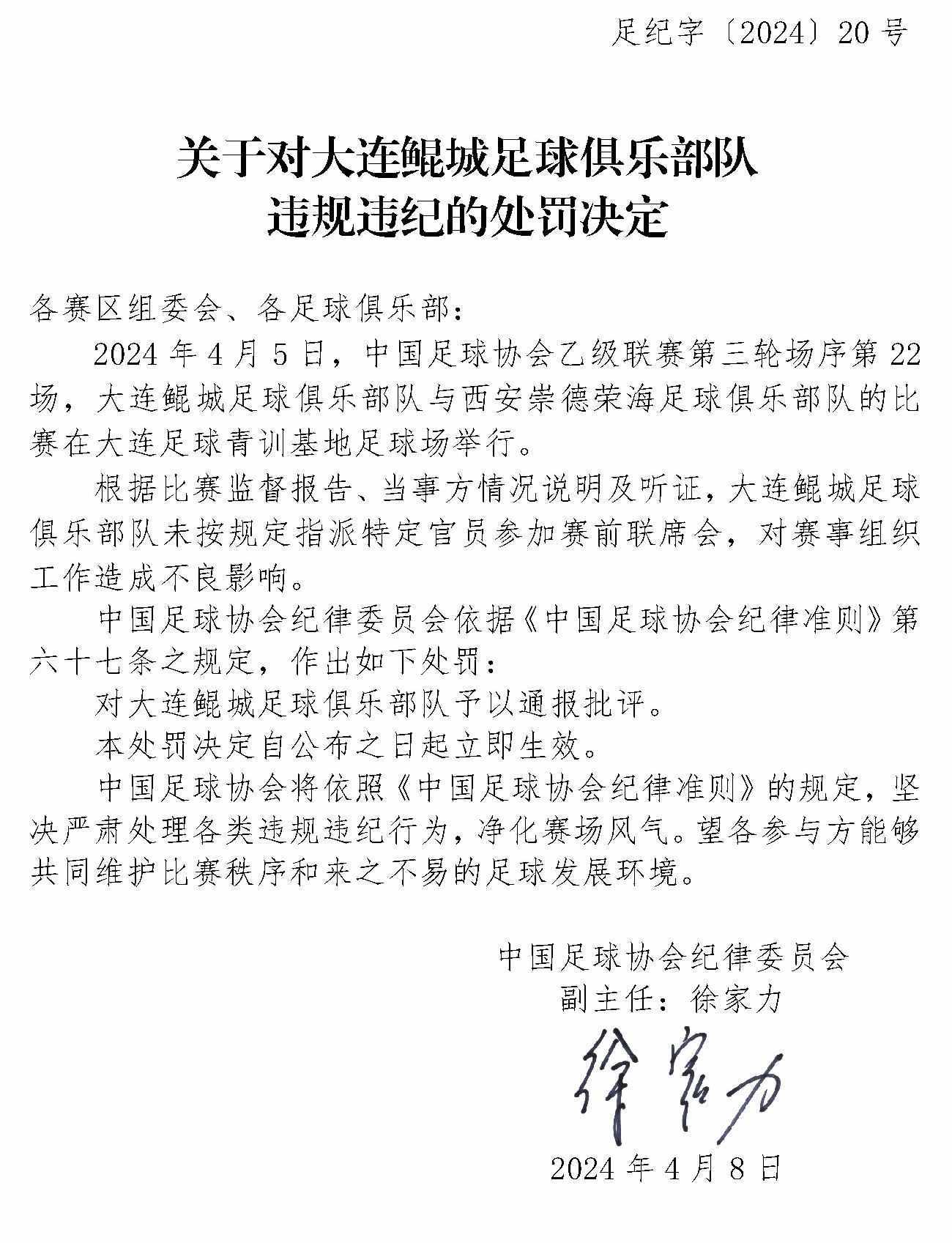 央視網(wǎng)消息:4月10日,中國(guó)足協(xié)網(wǎng)站發(fā)布《關(guān)于對(duì)上海嘉定匯龍足球俱樂部隊(duì)球員時(shí)間違規(guī)違紀(jì)的處罰決定》《關(guān)于對(duì)西安崇德榮海足球俱樂部隊(duì)違規(guī)違紀(jì)的處罰決定》《關(guān)于對(duì)大連鯤城足球俱樂部隊(duì)違規(guī)違紀(jì)的處罰決定》三份處罰決定。中甲聯(lián)賽上海嘉定匯龍9號(hào)球員因暴力行為被停賽罰款。中乙聯(lián)賽大連鯤城與西安崇德榮海兩家俱樂部因未按規(guī)定指派特定官員參加賽前聯(lián)席會(huì),被通報(bào)批評(píng)。