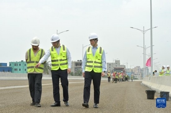 5月3日,姚堯(右)在孟加拉國達卡機場高架快速路項目上工作。新華社發(fā)