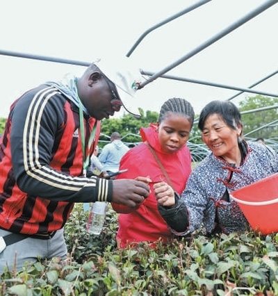 4月21日,在山東泰安道朗鎮(zhèn),非洲青年代表向茶農(nóng)學(xué)習(xí)采摘知識(shí)。本報(bào)記者 陳尚文攝
