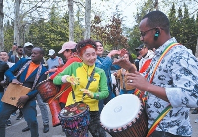 4月22日,在山東青島八大關(guān)街道,非洲青年代表與當(dāng)?shù)厣鐓^(qū)文藝隊(duì)成員熱情互動(dòng)。本報(bào)記者 陳尚文攝