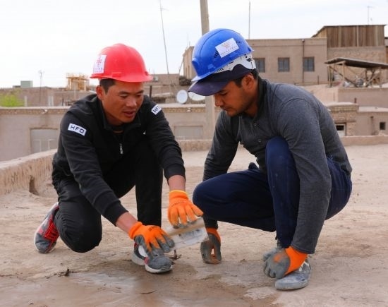 在烏茲別克斯坦希瓦古城哈?!つ吕聨?kù)什別吉清真寺,中方文物修復(fù)人員指導(dǎo)烏方工作人員修復(fù)清真寺屋頂。