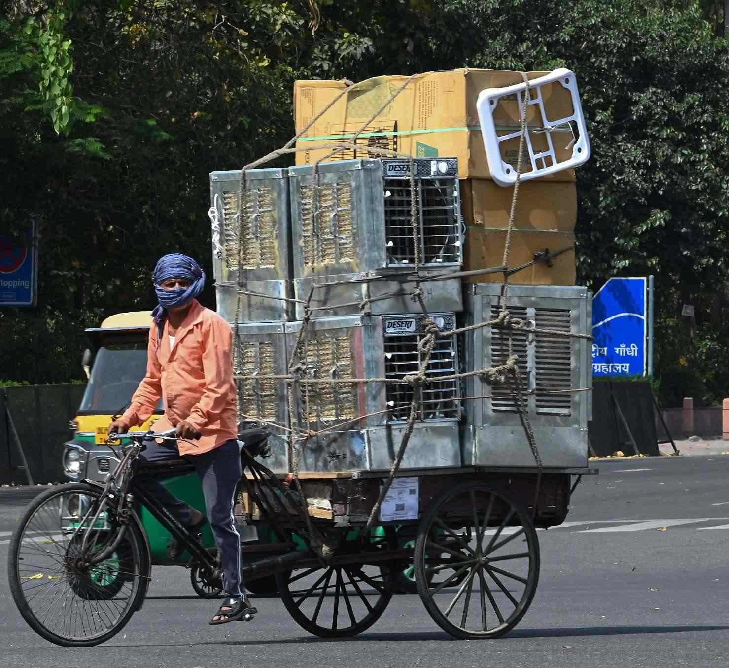 當?shù)貢r間2023年4月16日,印度新德里,氣溫飆升至40℃以上,工人運送冷氣機。
