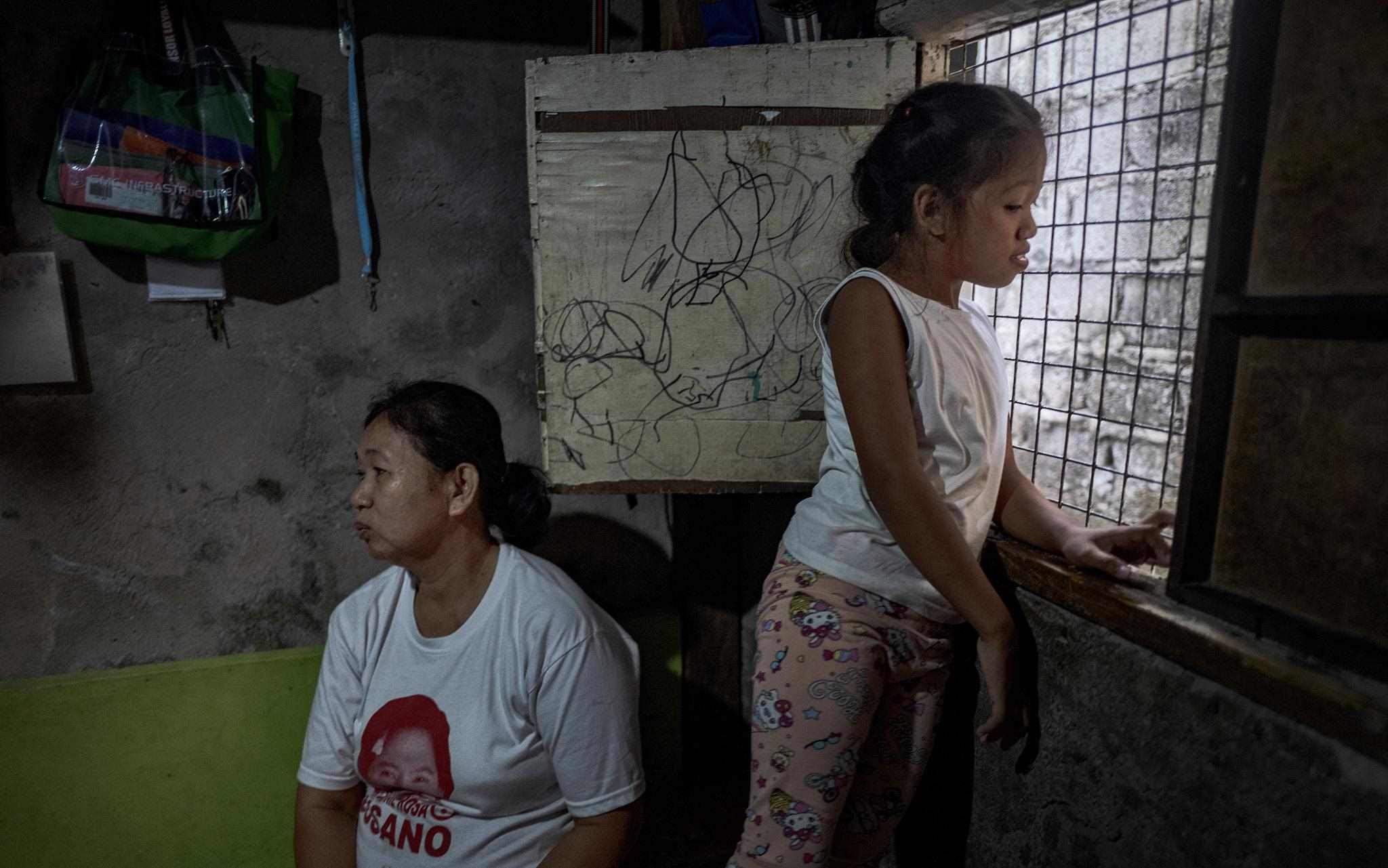 當?shù)貢r間2023年4月15日,菲律賓馬尼拉,奎松市,Corazon Mercado(左)和她的女兒Bea坐在家里。據(jù)Corazon Mercado說:“我們買不起大瓶或散裝的必需品,我們只能買得起小袋的日常必需品。”