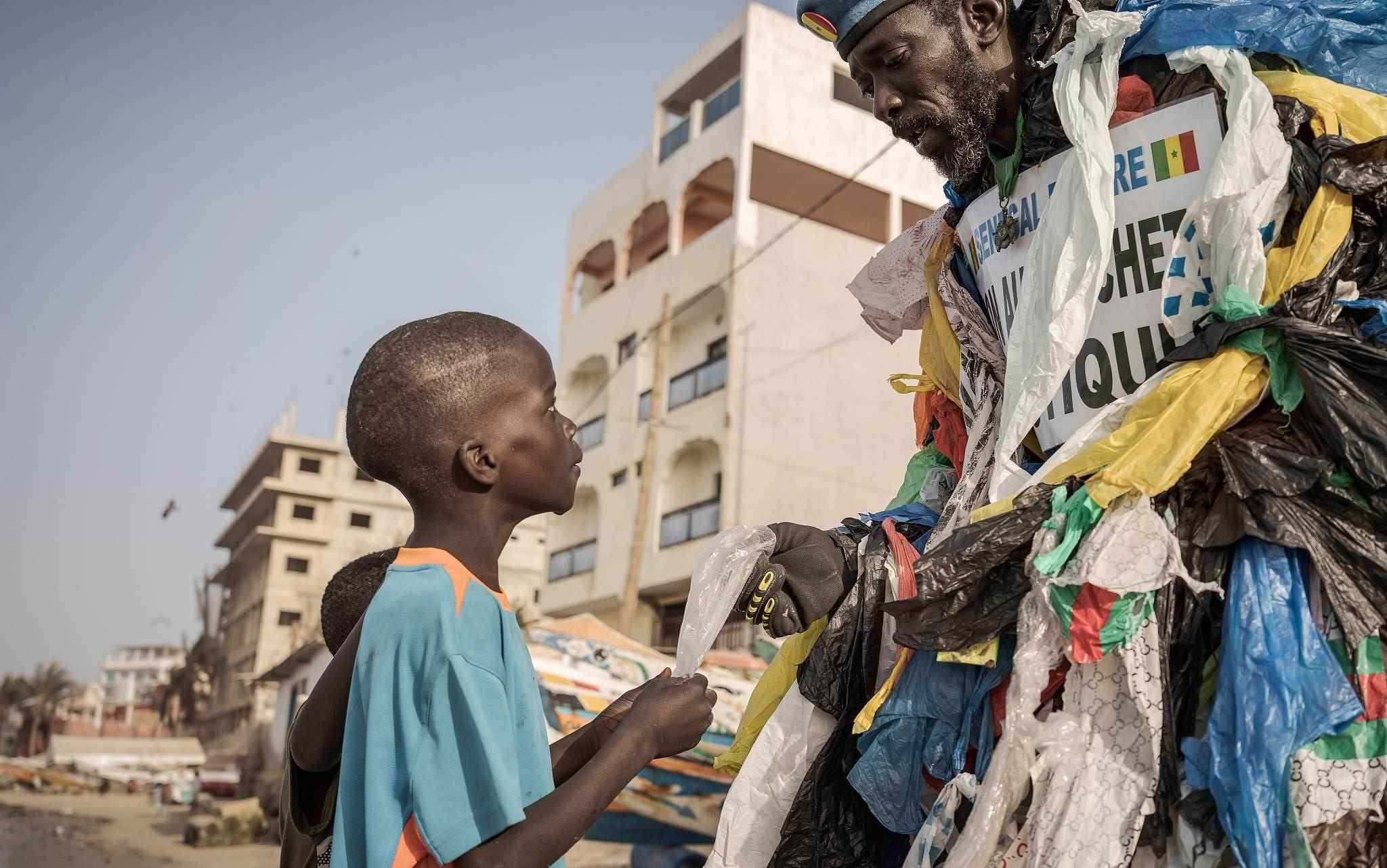 當?shù)貢r間2023年4月5日,塞內(nèi)加爾達喀爾,49歲的塞內(nèi)加爾環(huán)?;顒蛹夷拧し枺环Q為“塑料人”,和一個孩子在海灘上散步時拿著一個塑料包裝,提醒人們注意使用一次性塑料的污染。