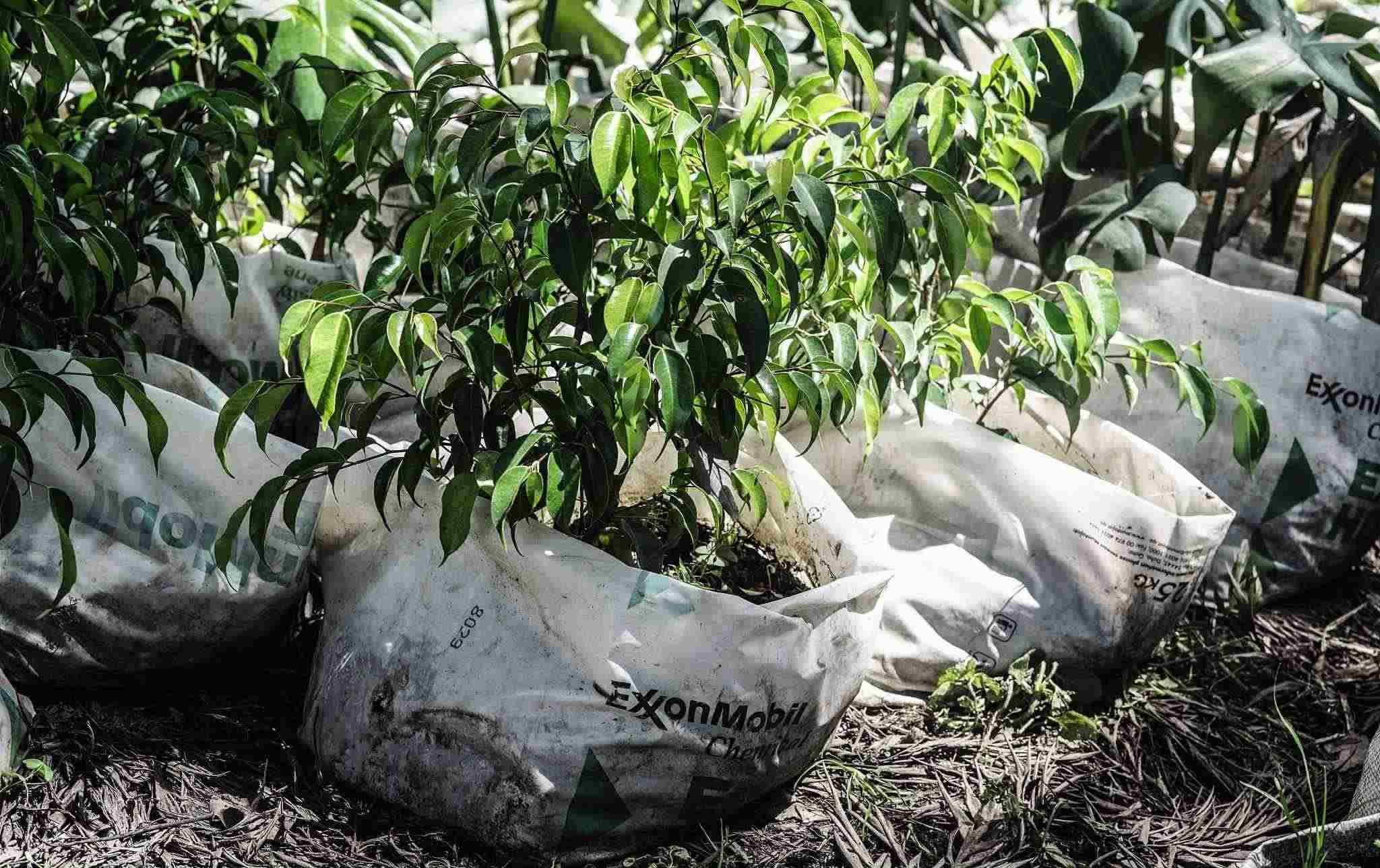 當?shù)貢r間2023年5月7日,肯尼亞納庫魯?shù)拿缙岳?,埃克森美孚包裝袋包裹著一棵樹苗。隨著世界充斥著塑料廢物,政府間談判委員會(INC)內(nèi)塑料條約的支持者正在倡導一項具有法律約束力的文書,減少石化工業(yè)生產(chǎn)的原生塑料。
