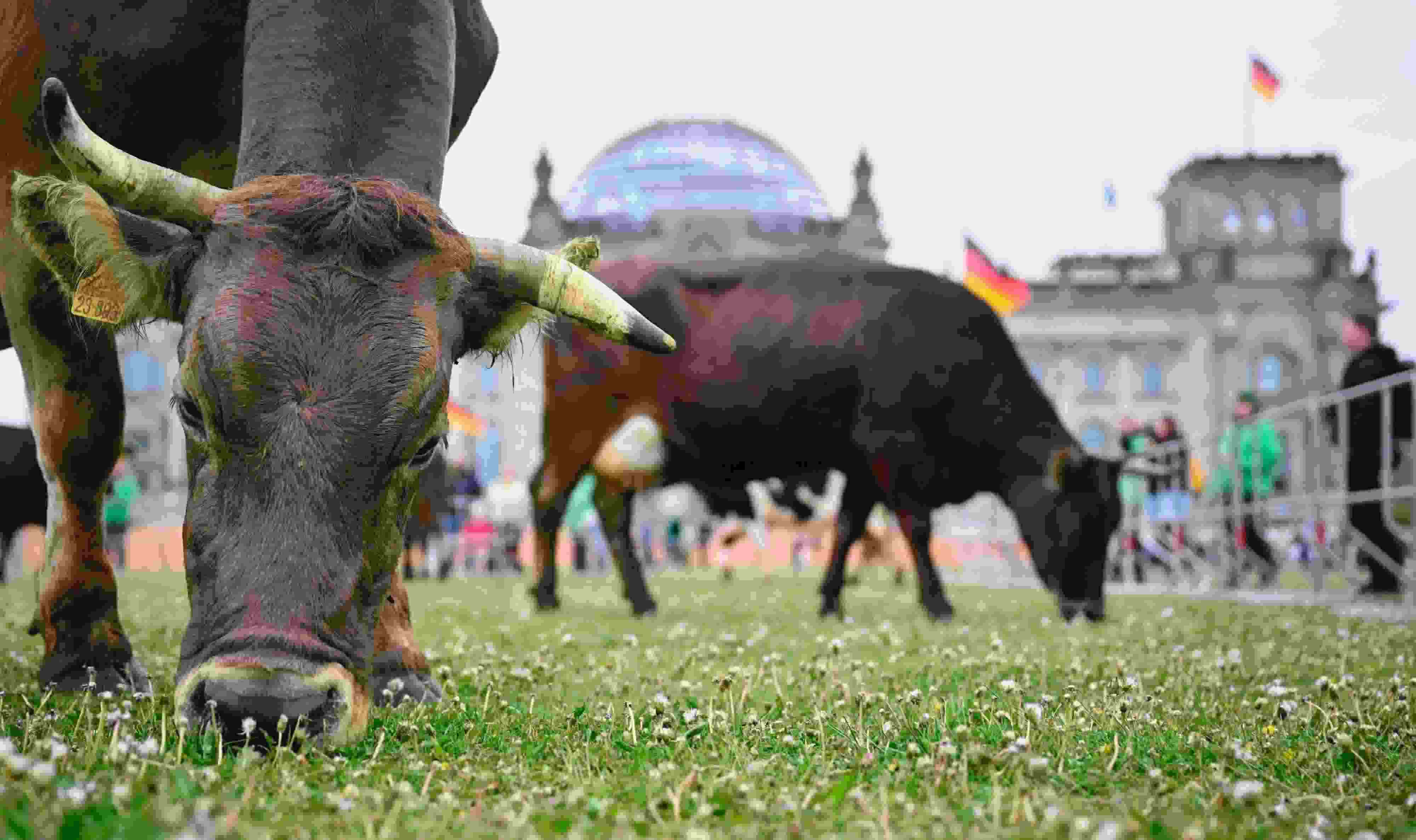 當(dāng)?shù)貢r(shí)間2023年5月16日,德國(guó)柏林,牛群被驅(qū)趕到國(guó)會(huì)大廈前吃草?;顒?dòng)組織者希望通過這一行動(dòng),呼吁政治家們采取更多措施來促進(jìn)牧場(chǎng)農(nóng)業(yè)。 視覺中國(guó)