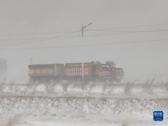 5月20日,在蒙古國蘇赫巴托爾省,貨車在暴風(fēng)雪中行駛。新華社發(fā)(蒙古國蘇赫巴托爾省BBS電視臺供圖)