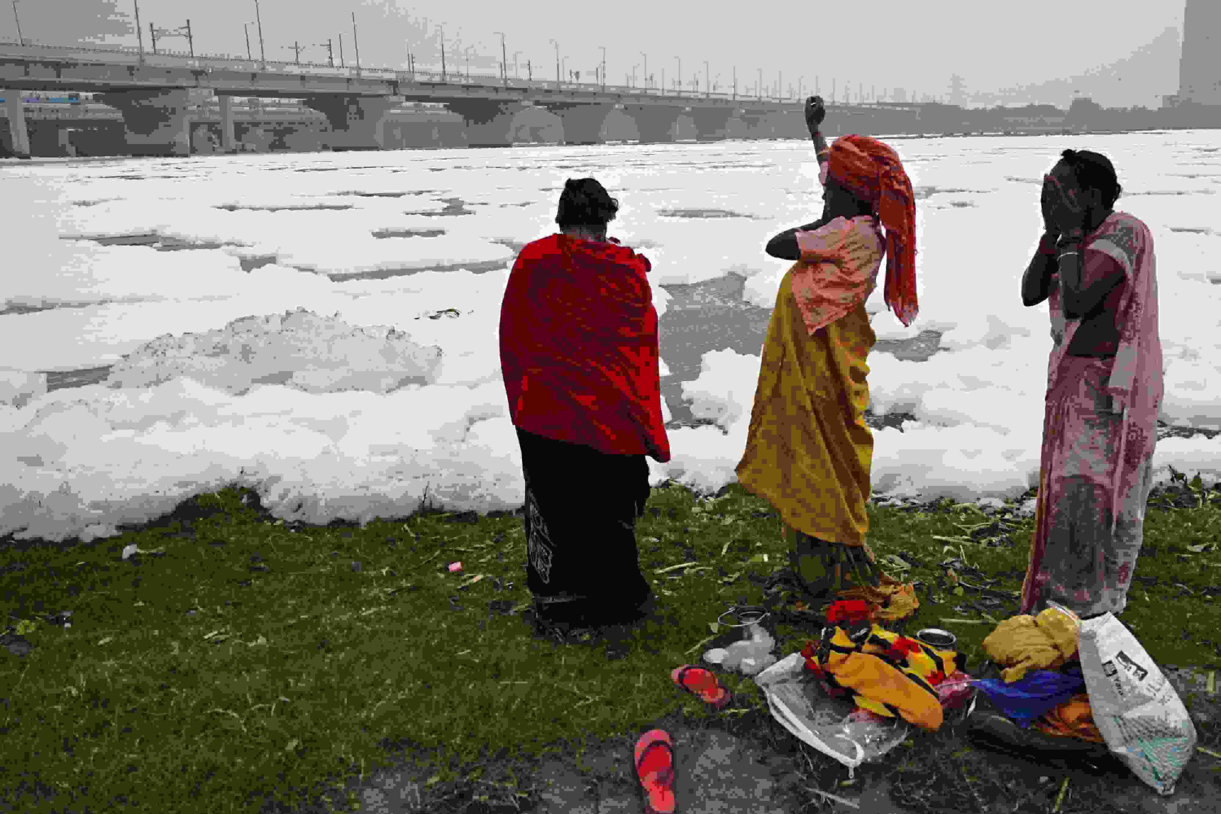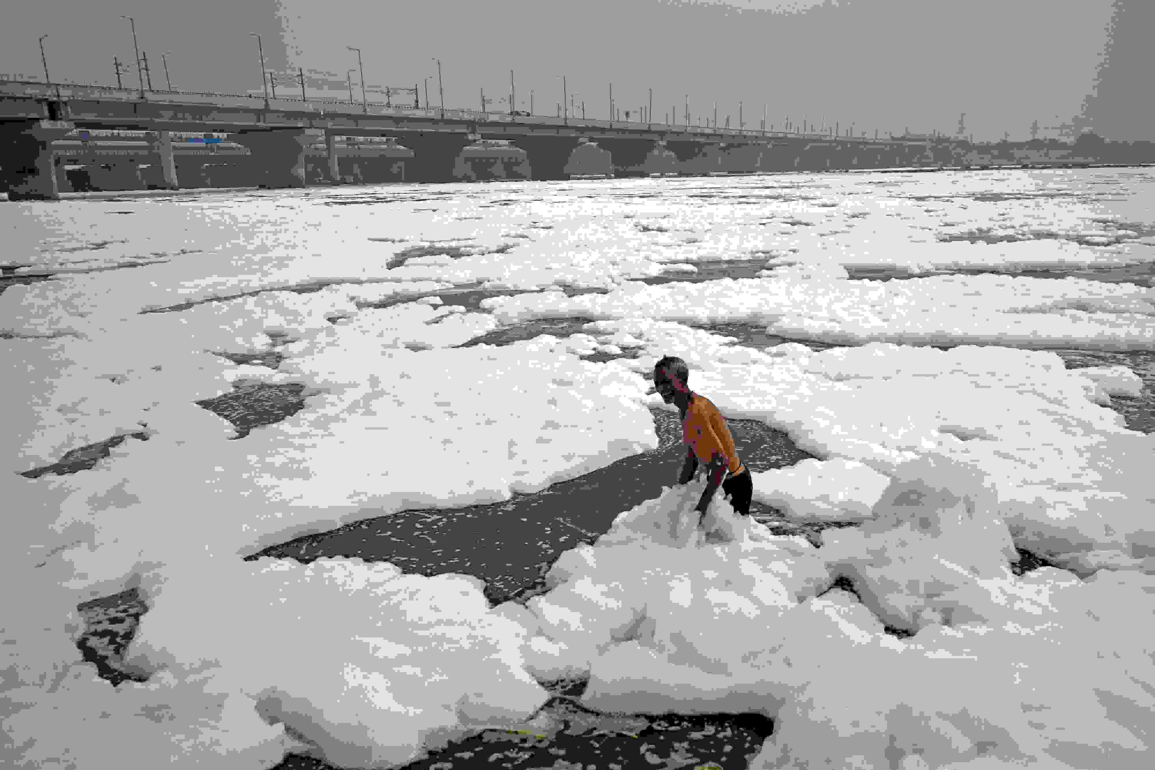 當(dāng)?shù)貢r間2023年6月4日,印度新德里,世界環(huán)境日前夕,人們在充滿有毒泡沫的亞穆納河中沐浴。 視覺中國