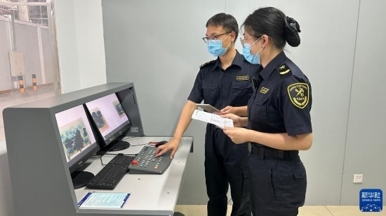 8月2日,中國鄭州機場海關(guān)關(guān)員用X光機對進口貨物開展非侵入式查驗。新華社發(fā)(鄭州機場海關(guān)供圖)