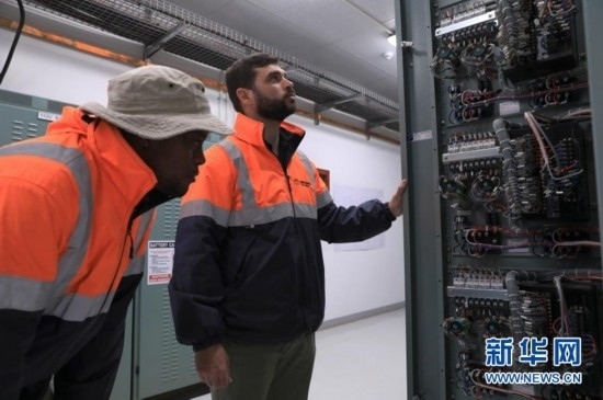 8月10日,在南非北開普省德阿鎮(zhèn),當(dāng)?shù)鼐用瘛⒆冸娬竟ぷ魅藛T達(dá)斯溫·巴松(左)與變電站副主管雷加特·范滕德在龍?jiān)茨戏枪镜掳L(fēng)電項(xiàng)目變電站工作。新華社記者 董江輝 攝