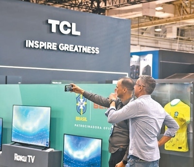 在2023年圣保羅國(guó)際消費(fèi)類(lèi)電子及家用電器產(chǎn)品展覽會(huì)上,參觀者在TCL展臺(tái)前合影留念。本報(bào)記者 時(shí)元皓攝