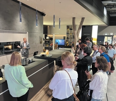 在2022年柏林國(guó)際消費(fèi)電子展期間,參觀者在卡薩帝展臺(tái)前了解智能廚房設(shè)備。本報(bào)記者 李 強(qiáng)攝