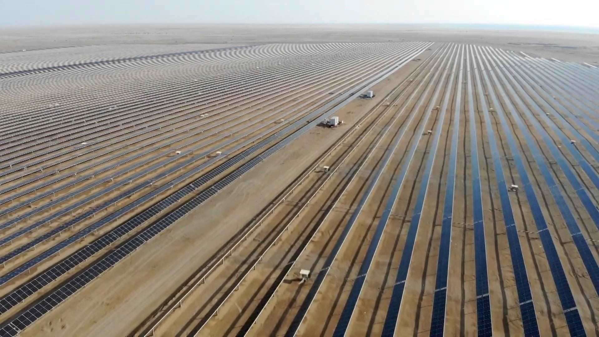 紅海之濱,中沙正攜手在沙漠里打造一座未來之城。紅海新城,是中沙在綠色低碳領域重點合作項目,未來這里的電力供應將100%來自清潔能源。在中國企業(yè)建設的其中一個光伏廠區(qū)內(nèi),4068排光伏板整齊排列,24小時不間斷為新城提供可再生能源。針對當?shù)厣硥m頻繁的天氣,中國企業(yè)還專門設計了自動清掃機器人。