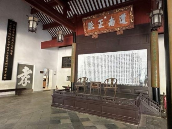 在岳麓書院中央的講堂,陳列著《岳麓書院記》的屏風。(本報記者 劉書文攝)