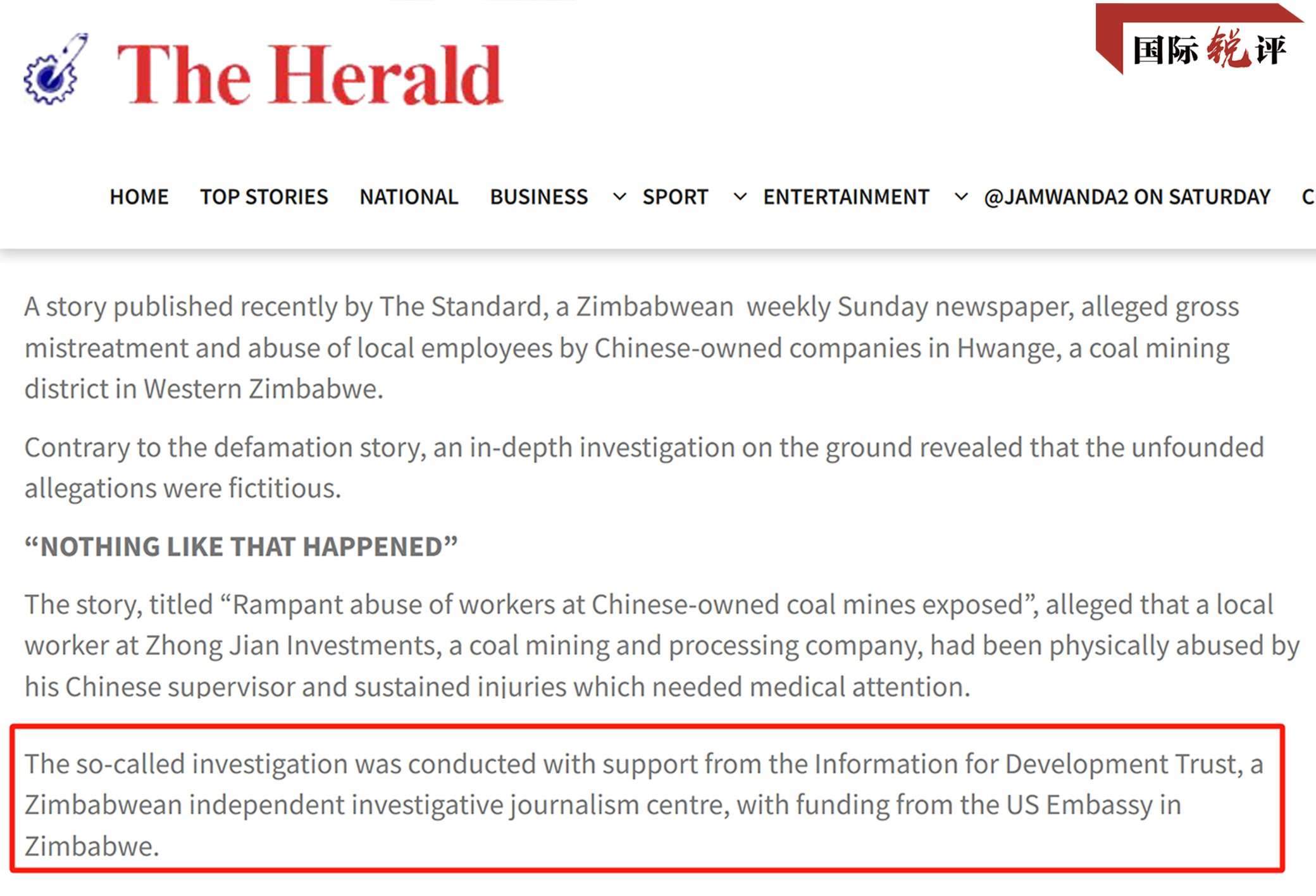 2022年5月,津巴布韋媒體《標(biāo)準(zhǔn)報(bào)》發(fā)布了一篇報(bào)道,污蔑中國(guó)礦企虐待當(dāng)?shù)貑T工,稱這名員工“受傷送醫(yī),還被解雇了”。這家媒體稱,報(bào)道是和津巴布韋一個(gè)名叫“信息促進(jìn)發(fā)展信托基金(IDT)”的機(jī)構(gòu)合作完成的。然而很快,津巴布韋《先驅(qū)報(bào)》就發(fā)文,用大量事實(shí)證明,這名員工只是和中方員工發(fā)生了小口角,并沒有被毆打,也沒有被解雇。