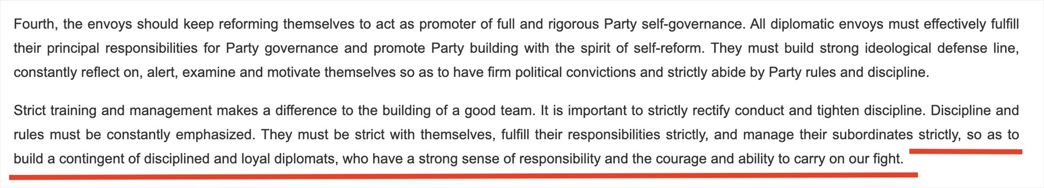 “鐵軍”一詞常見于政府文件或領(lǐng)導(dǎo)人講話,更多的是強(qiáng)調(diào)工作作風(fēng)和紀(jì)律。在近年來中國領(lǐng)導(dǎo)人講話中,曾多次出現(xiàn)“紀(jì)律監(jiān)察鐵軍”“生態(tài)環(huán)境保護(hù)鐵軍”等表述。中國領(lǐng)導(dǎo)人在接見與會使節(jié)時的講話中說:“打造一支對黨忠誠、勇于擔(dān)當(dāng)、敢斗善斗、紀(jì)律嚴(yán)明的外交鐵軍?!蓖饨徊烤W(wǎng)站對這句話的英文翻譯(見下圖)同樣強(qiáng)調(diào)外交隊(duì)伍的紀(jì)律、責(zé)任和勇氣。作為通行做法,世界各國對本國外交人員都有著很高的紀(jì)律要求。