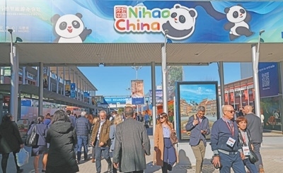 會(huì)展中心外側(cè)主通道的顯著位置,印有“你好!中國(guó)”國(guó)家旅游形象圖案的廣告牌。本報(bào)記者 許海林?jǐn)z
