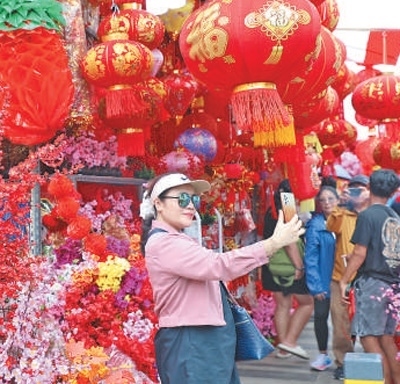 春節(jié)期間,印度尼西亞首都雅加達(dá)的中國城一派喜慶氣氛。圖為當(dāng)?shù)厥忻裨诮诌吷啼佔(zhàn)耘摹?/p>