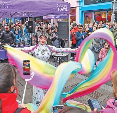 2月11日,2024年愛爾蘭“歡樂春節(jié)”活動在首都都柏林開幕。圖為川劇《天女散花》表演。