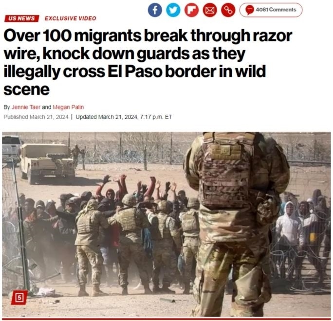 中新網(wǎng)3月22日電 綜合外媒報道,當(dāng)?shù)貢r間21日,在得克薩斯州邊境墻附近,有上百名非法移民沖破鐵絲網(wǎng)試圖非法進(jìn)入美國。他們撞倒得州國民警衛(wèi)隊(duì)成員,試圖越過美墨邊境,場面一度十分混亂。
