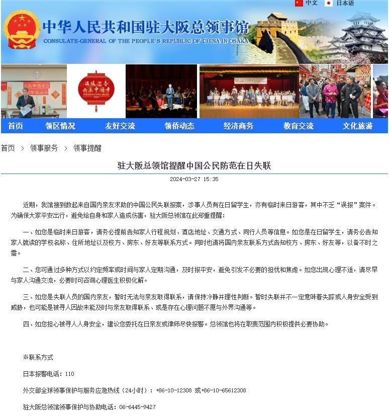 央視網(wǎng)消息:據(jù)中國駐大阪總領(lǐng)事館,近期,我館接到數(shù)起來自國內(nèi)親友求助的中國公民失聯(lián)報(bào)案,涉事人員有在日留學(xué)生,亦有臨時(shí)來日游客,其中不乏“誤報(bào)”案件。為確保大家平安出行,避免給自身和家人造成傷害,駐大阪總領(lǐng)館在此鄭重提醒:??