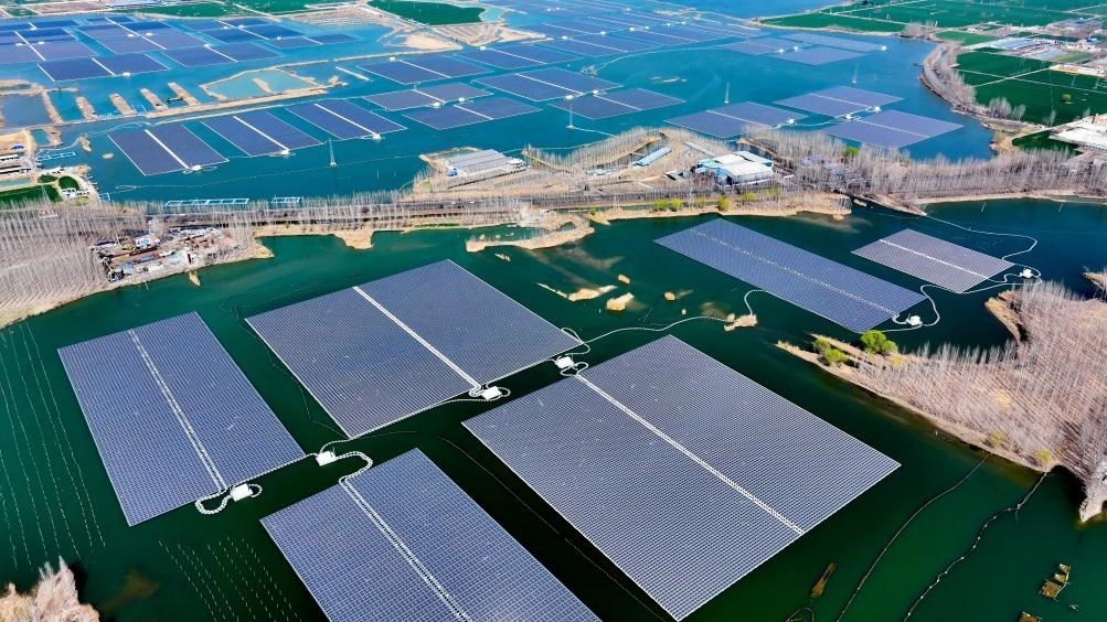 ?這是山東省濟寧市微山縣驩城鎮(zhèn)利用采煤塌陷區(qū)約3600畝水面建設的漁光互補項目(2024年3月20日攝,無人機照片)。該項目集光伏發(fā)電、漁業(yè)養(yǎng)殖、生態(tài)修復于一體。新華社記者郭緒雷攝