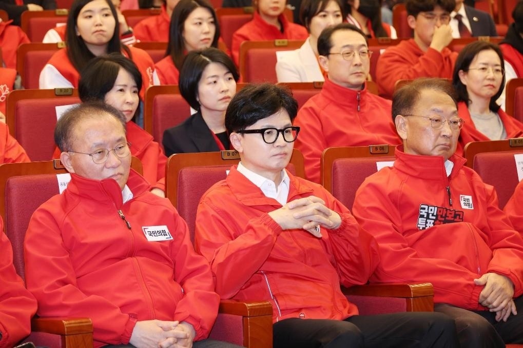 4月10日,在韓國(guó)首爾,國(guó)民力量黨領(lǐng)導(dǎo)人韓東勛(前排中)觀看出口民調(diào)。新華社/紐西斯通訊社