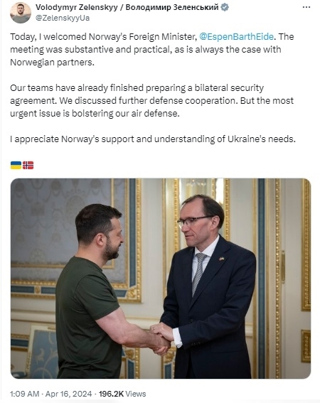 中新網(wǎng)4月16日電 據(jù)法新社報(bào)道,挪威方面當(dāng)?shù)貢r(shí)間15日表示,該國已與烏克蘭達(dá)成一項(xiàng)安全協(xié)議。挪威外交部長稱,該協(xié)議將在澤連斯基下次與挪威首相斯特勒會(huì)面期間簽署并公布。同日早些時(shí)候,烏克蘭總統(tǒng)澤連斯基表示,烏克蘭已與9國簽署雙邊安全協(xié)議。