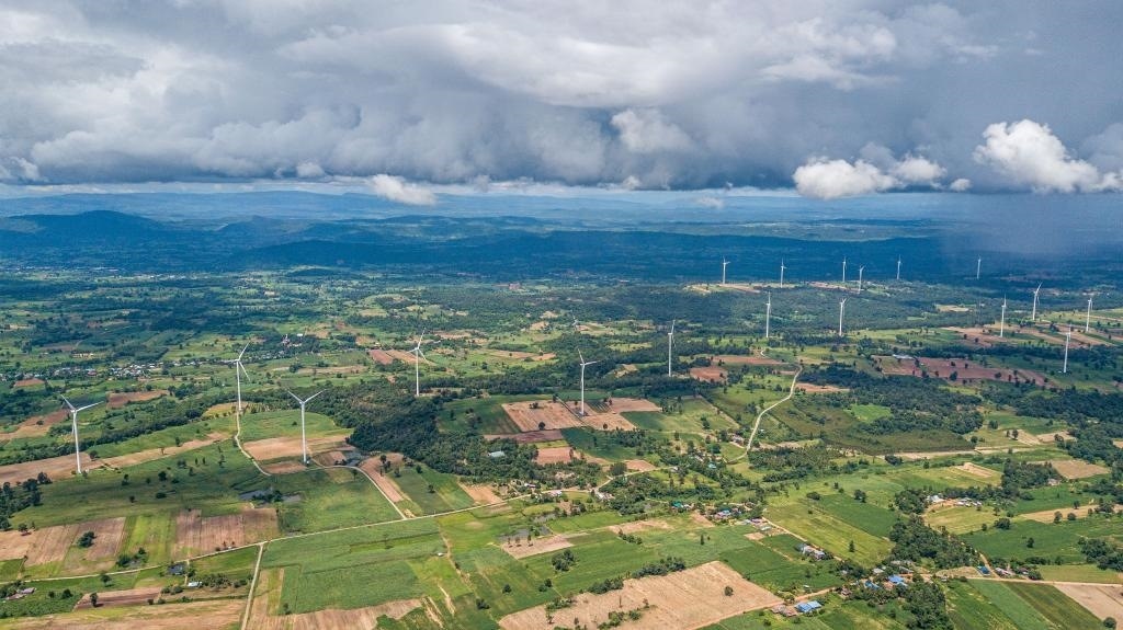 這是2023年10月5日在泰國猜也蓬府拍攝的由中國金風(fēng)科技提供的風(fēng)力發(fā)電機(jī)(無人機(jī)照片)。新華社記者王騰攝