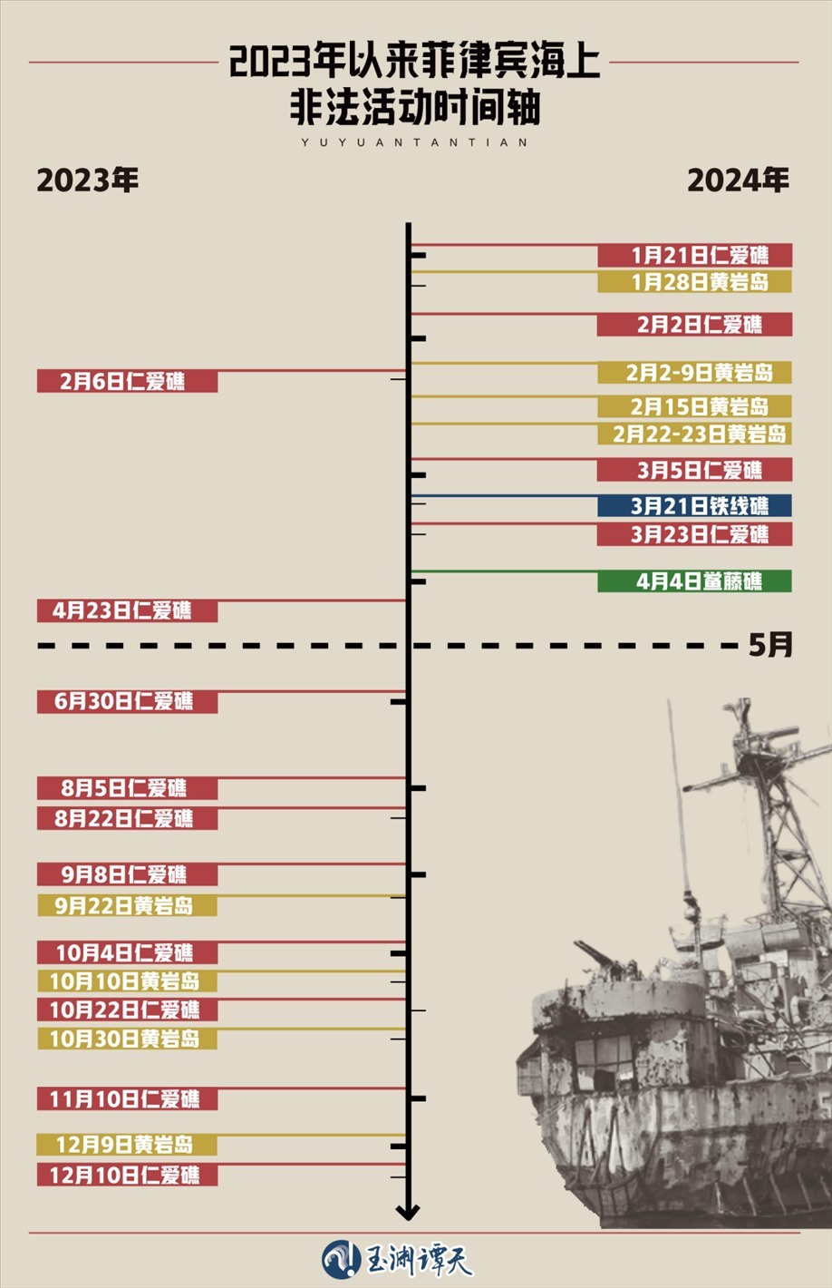 這是2023年以來,菲律賓在南海挑釁滋事的時間線,可以看到,在防務(wù)準(zhǔn)則更新后,菲律賓在南海挑釁滋事的頻次驟增。