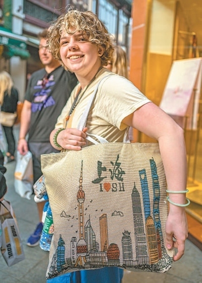 在上海豫園商城內(nèi),馬斯卡廷中學學生展示選購的商品。王 初攝(人民視覺)