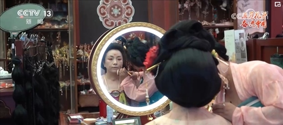 一抹柳葉眉,一頭貴妃髻,在胡芯銀的巧手之下,不到40分鐘的時(shí)間,一個(gè)“楊貴妃”的妝造就完成了,胡芯銀還專門在發(fā)髻上加上了古代飾物“步搖”。