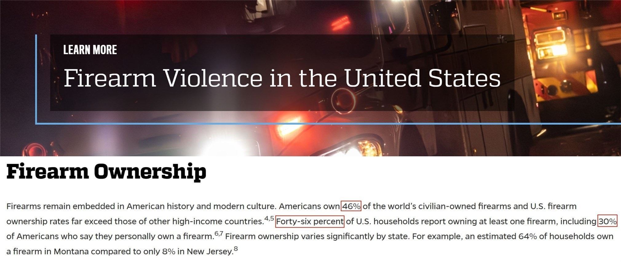 約翰斯·霍普金斯大學(xué)槍支暴力解決方案中心2023年發(fā)布的數(shù)據(jù)顯示,世界上近一半(46%)的民用槍支在美國;近一半(46%)的美國家庭報告擁有至少一把槍,其中30%的人承認自己擁有槍支。