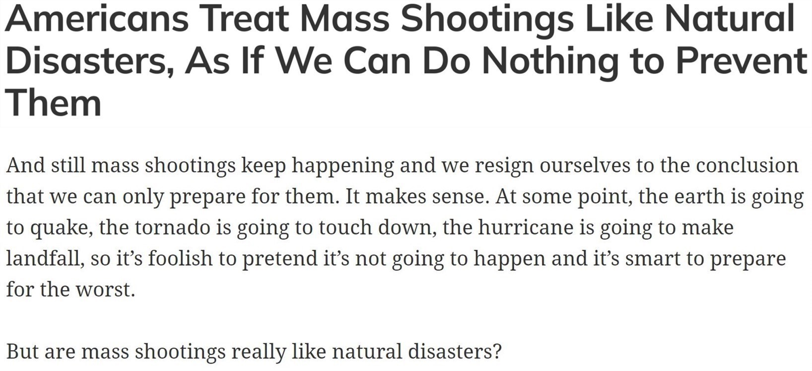 有美媒稱,對于一起又一起槍擊事件,如今的美國只是進行數(shù)字的統(tǒng)計,卻無力采取行動改變現(xiàn)狀,似乎在美國人眼里,槍支暴力已經(jīng)成為像洪水、颶風(fēng)、野火一樣的“天災(zāi)”,而不是可以預(yù)防的人禍。