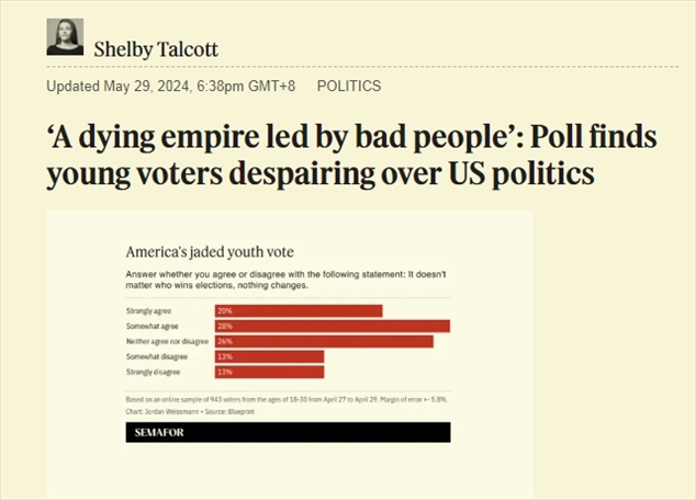 中國日報網(wǎng)5月30日電 當?shù)貢r間29日,美國媒體Semafor網(wǎng)站報道,民主黨戰(zhàn)略組織“Blueprint”公布的一項最新民意調(diào)查顯示,美國18歲至30歲的選民中至少有一半人對美國的政治制度持負面看法,其中超過60%的人認為美國正在衰落。