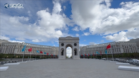 ||譚主抵達(dá)阿斯塔納,象征著哈薩克斯坦歷史的“凱旋門”周圍飄揚(yáng)著歡迎旗幟